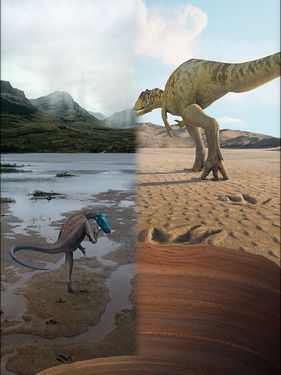 Representação paeloambiental do icnosítio Tangará Ecopark, localizado em Fortaleza dos Nogueiras, no Maranhão. Os registros neste local são dos mais importantes do Brasil para o conhecimento sobre a diversidade e ocorrência de terópodes no norte do Brasil durante o Jurássico inferior, com animais, inclusive, relacionados ao Dilofossauro e seus parentes próximos.